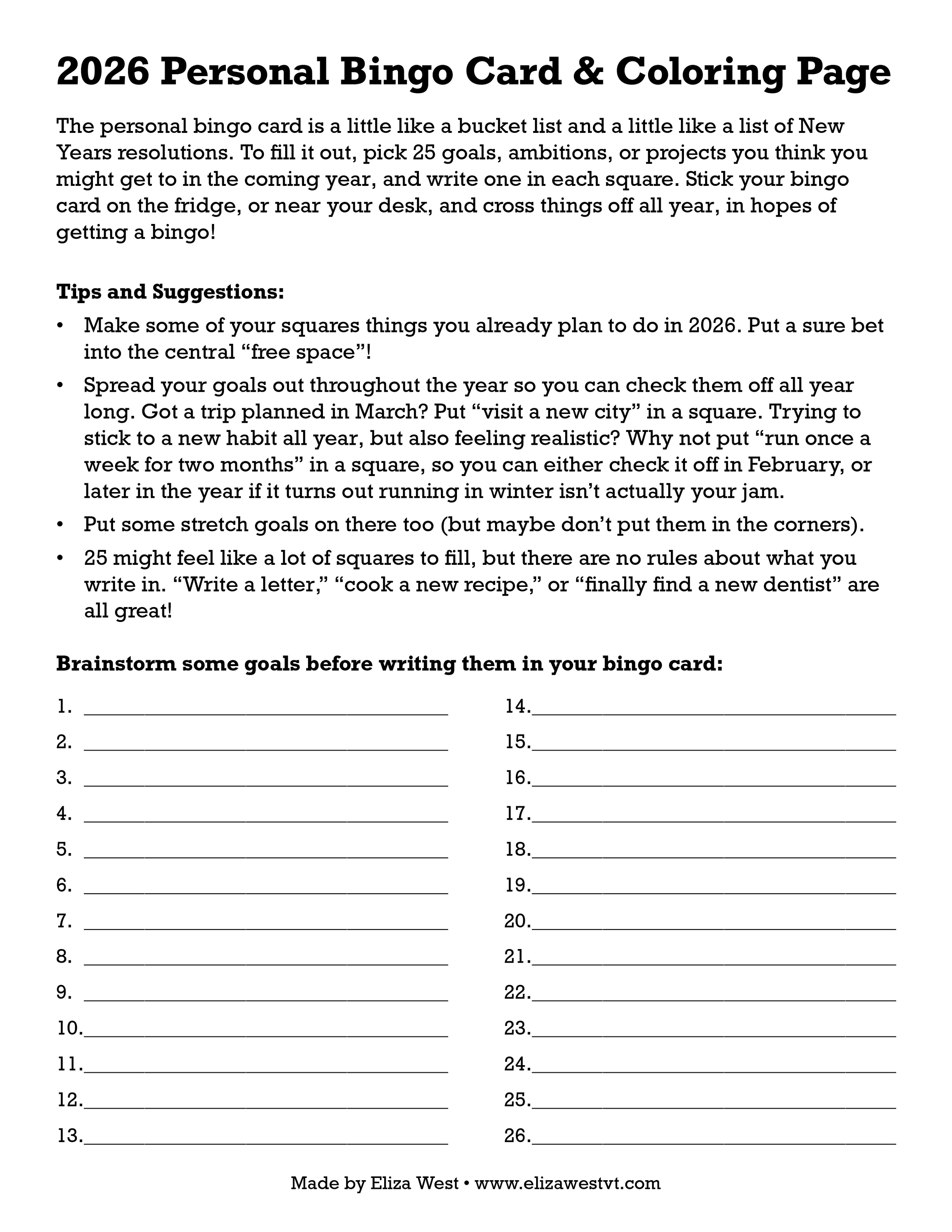 2026 Personal Bingo Card and Coloring Page