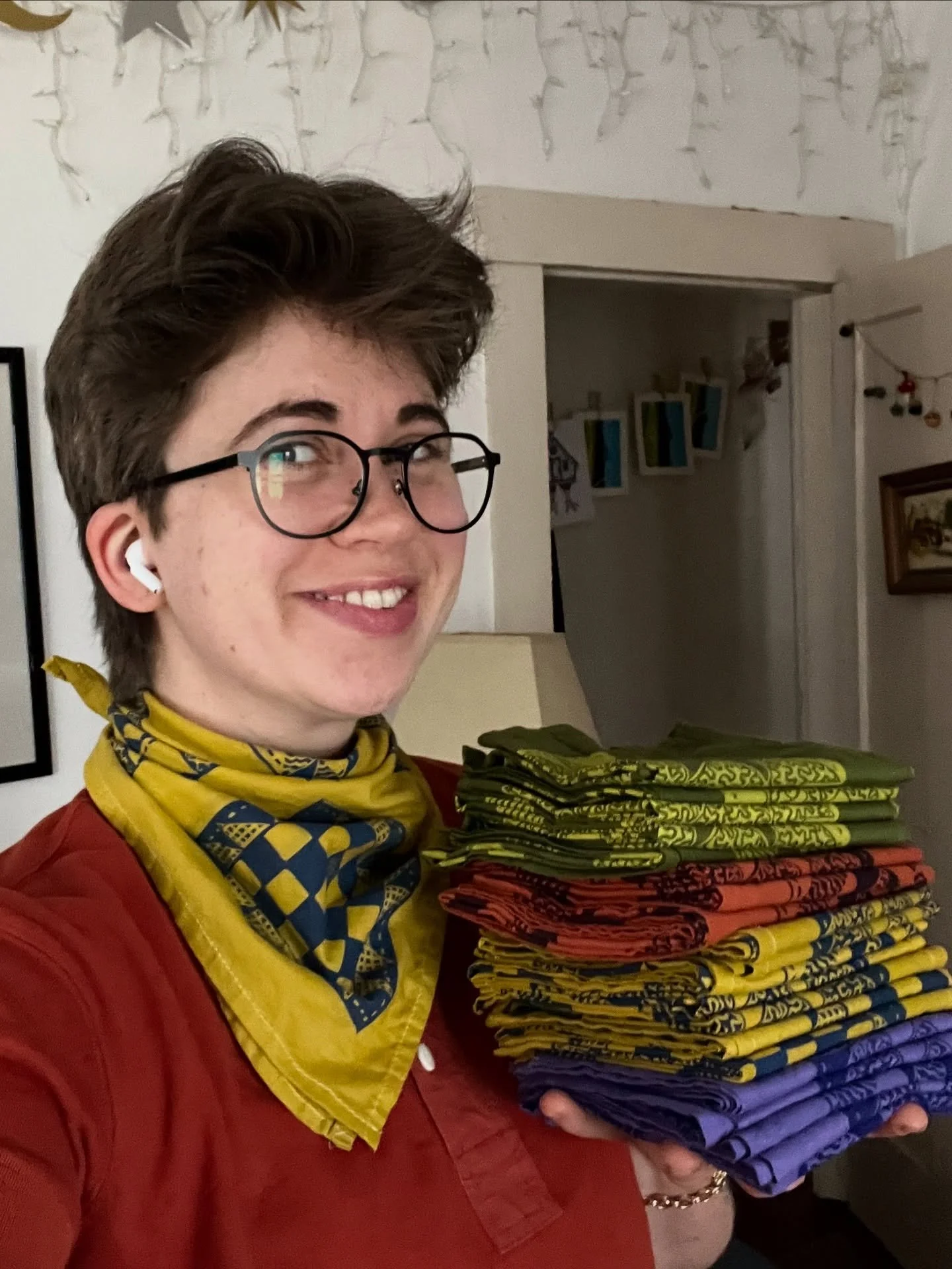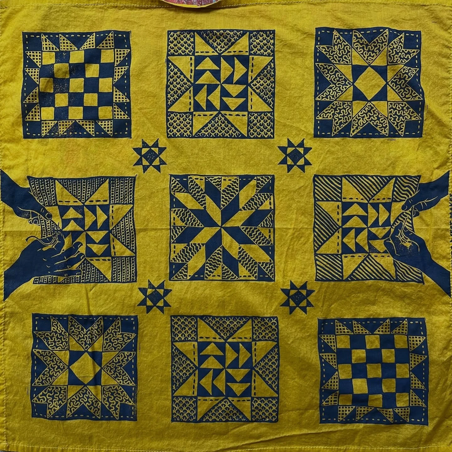 All of my designs are hand block printed onto 22” Japanese cotton bandanas. I typically have a variety of designs in several colors at any given time, but I don’t necessarily still have the designs or colors shown here.